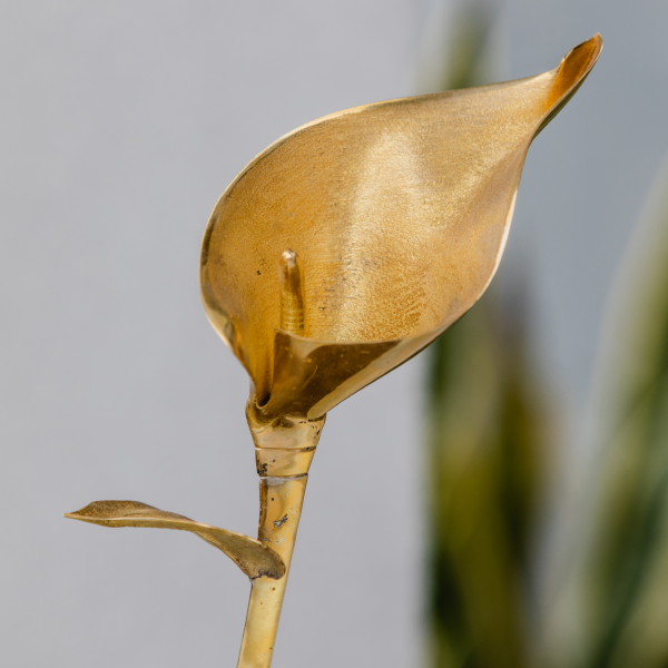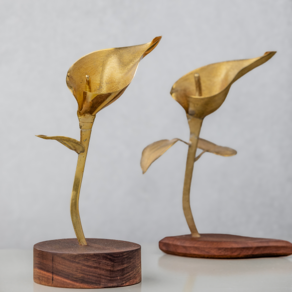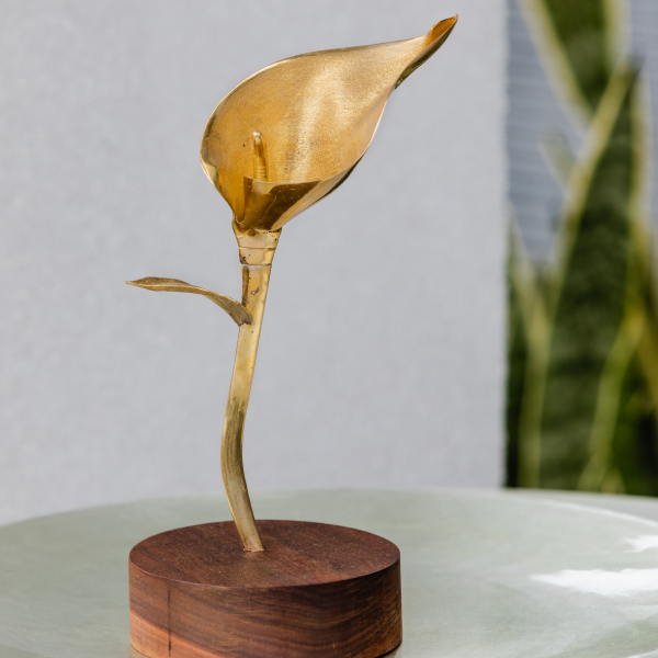 La cala, con su forma elegante y sobria, es un símbolo de pureza y belleza.  La versión en plata o bronce, con una o dos hojas, en posición vertical o recostada sobre una base de piedra natural o madera, transmite serenidad, fortaleza y sofisticación.